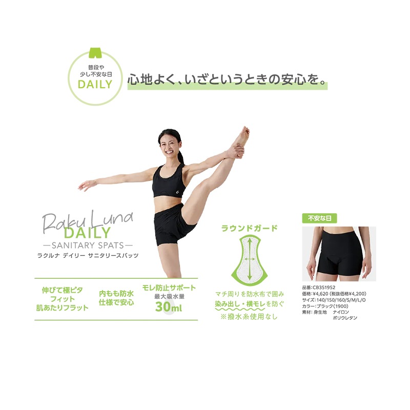 ☆ラクルナ デイリー サニタリースパッツ 女性アスリートのパフォーマンスをサポートする吸水スパッツを開発。吸水性のある3層構造のマチ部と内もも防水仕様により、不安な日に安心を。